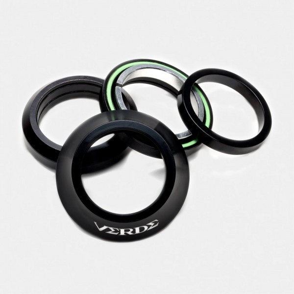 The Verde Regent 10 integrated headset is a Campy style headset with two precision sealed cartridge bearings, alloy compression ring, a 10mm tall (8mm stack height) aluminum top cap with laser-etched Verde logo, rubber O-ring for a tight fit and a 5mm tall headset spacer to help dial in your stem height.