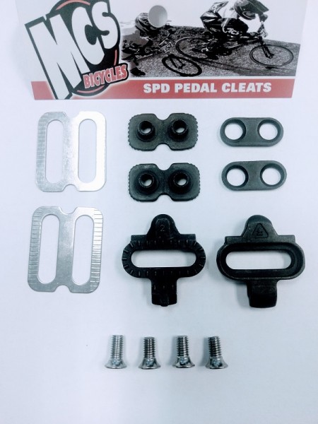 This MCS Components SPD Pedal Cleat Kit Expert/Pro (BMX & MTB racing) riders using SPD type pedals. This system features a 2 hole bolt pattern for bmx/mtb shoes and includes 2 metal spacing shims, 4 screws and all the hardware to install correctly in your shoes.