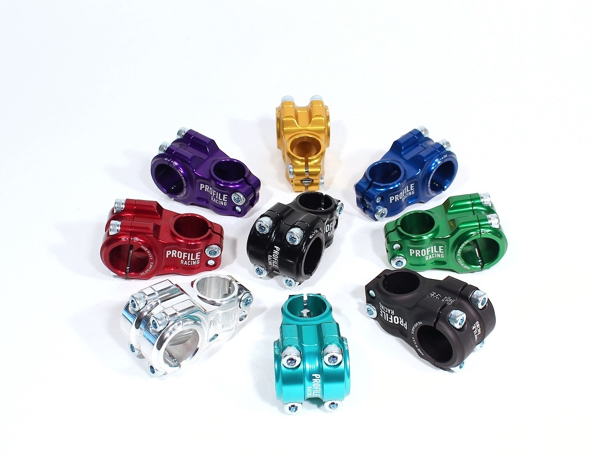 The Profile Nova Stem is a Moto Clamp style front load cap stem and is designed to be used with a 31.8mm oversize handlebar and 1-1/8 steerer tube. It is available in three sizes 48mm, 53mm & 58mm and eight colors Black, Blue Gold, Green, Matte Back, Polished, Purple & Red. It uses 8mm hex bolts.