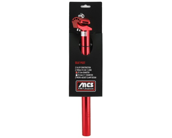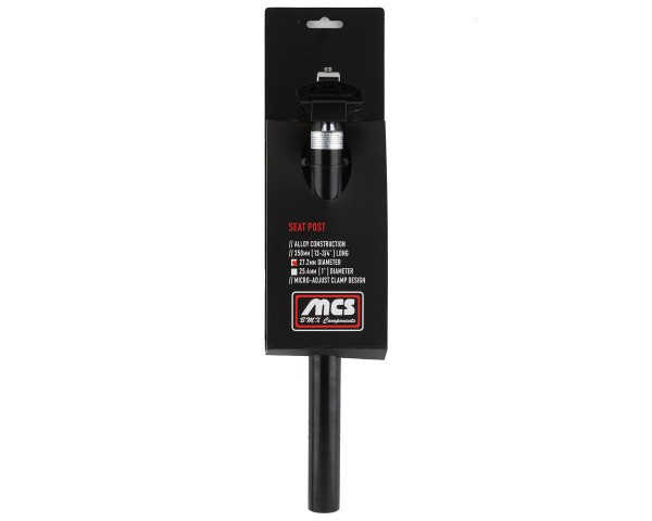 MCS newest alloy construction seat post for railed seats, featuring a micro-adjust clamp design and a smooth anodized finish.
